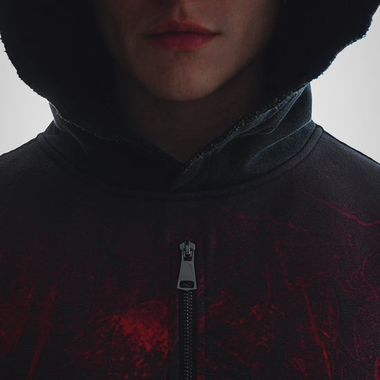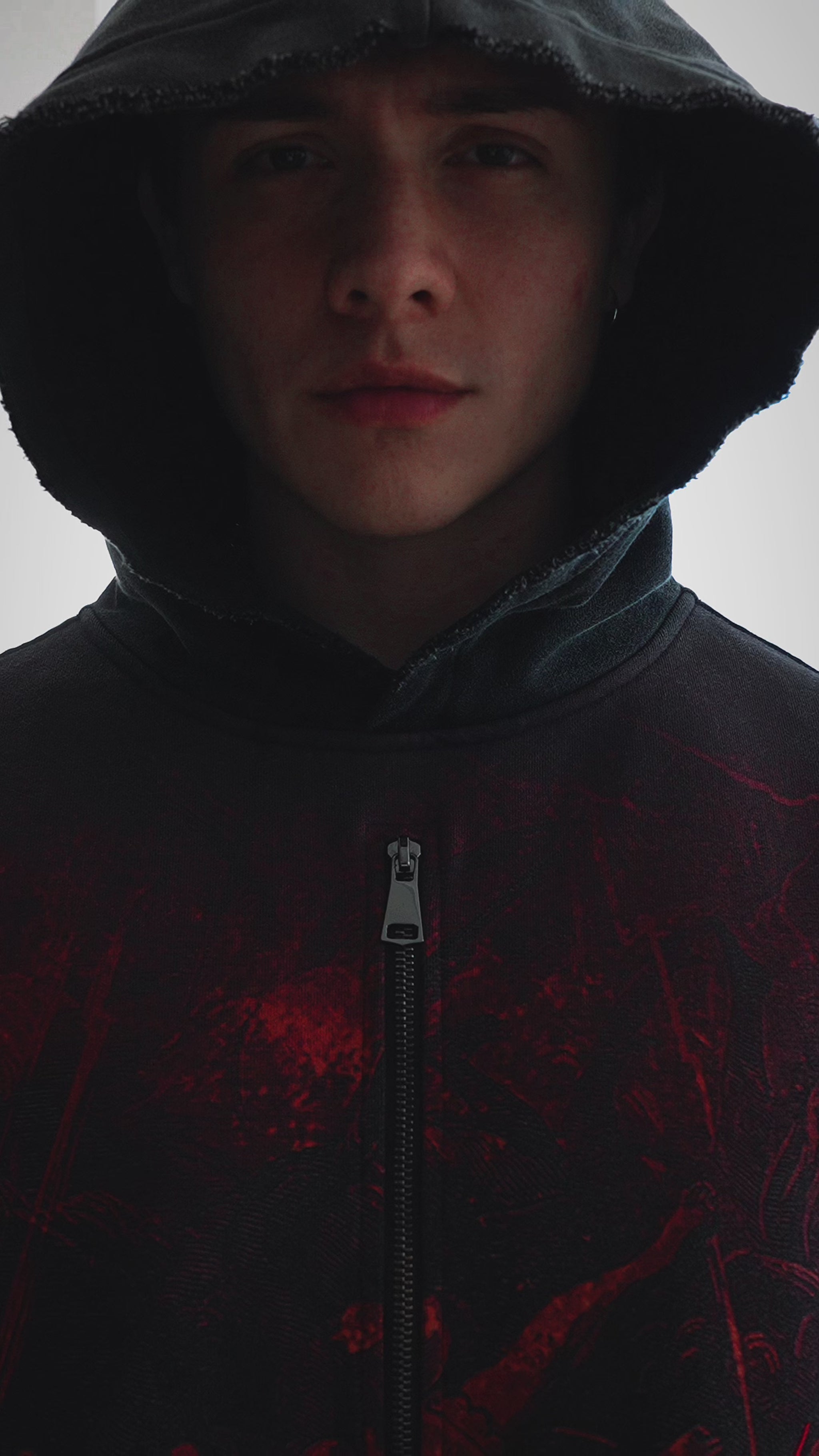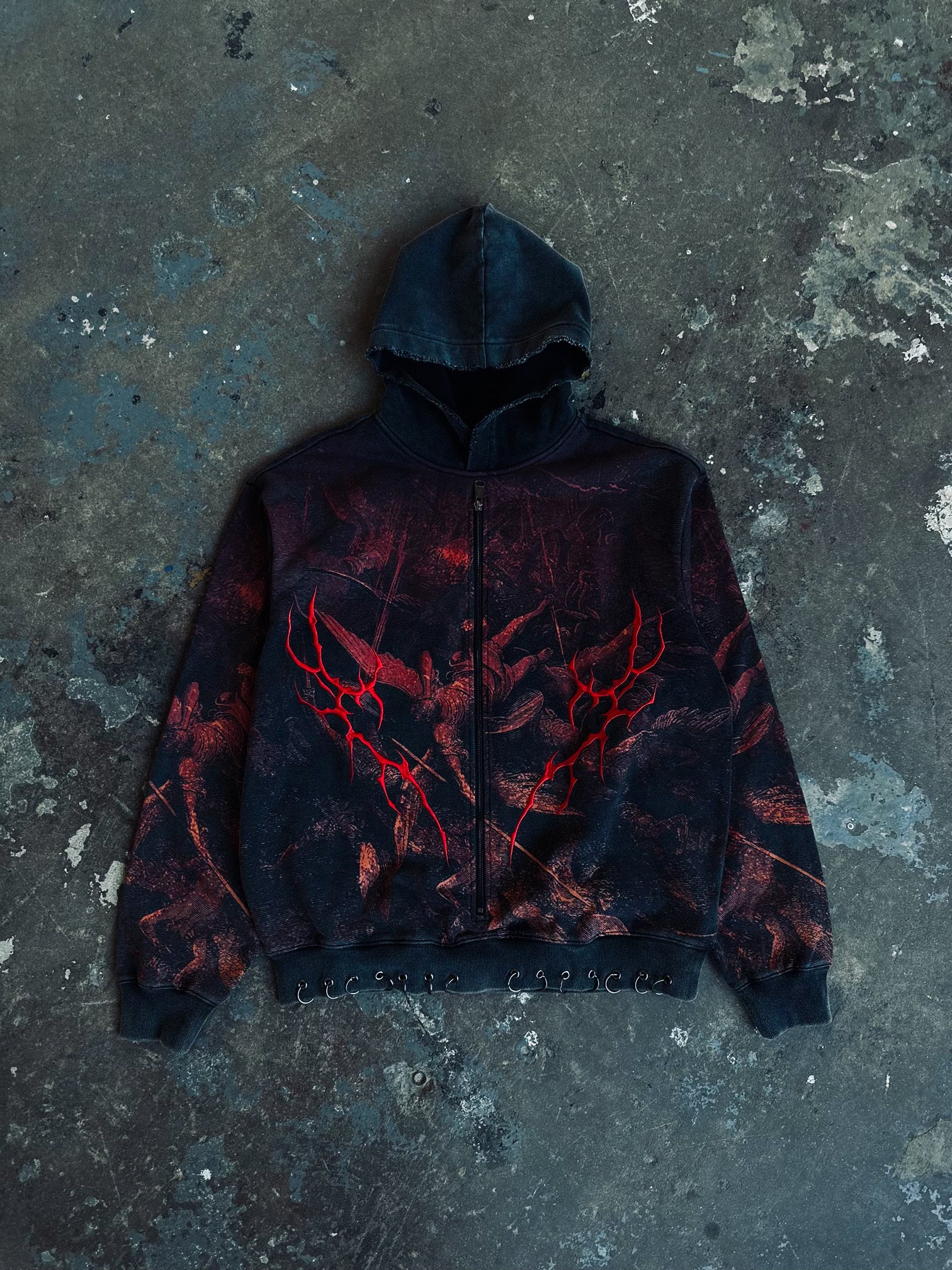 The hoodie features 7 ring piercings on both the left and right, a textured mural, vintage & distressed heavyweight cotton material and a non-opened zipper revealing my version of Michael The Archangels sword.